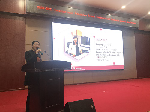 佟玉平院长在会上致开幕词。佟玉平院长首先回顾了2020年的抗疫历程,2020年虽然有许多始料不及的困难和辛苦,但是在学院上下的通力合作下都被一一克服。佟院长赞扬了国际教育学院老师们的辛苦付出和同学们的认真配合。佟院长还阐述了2021年的工作规划和未来对同学们的期望,最后祝愿在场的所有老师和同学在新的一年里都能更上一层楼。