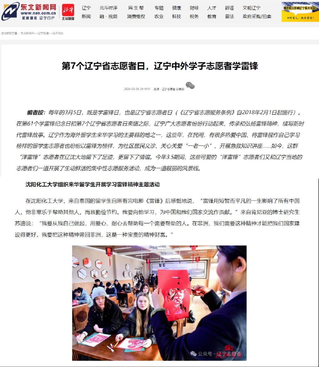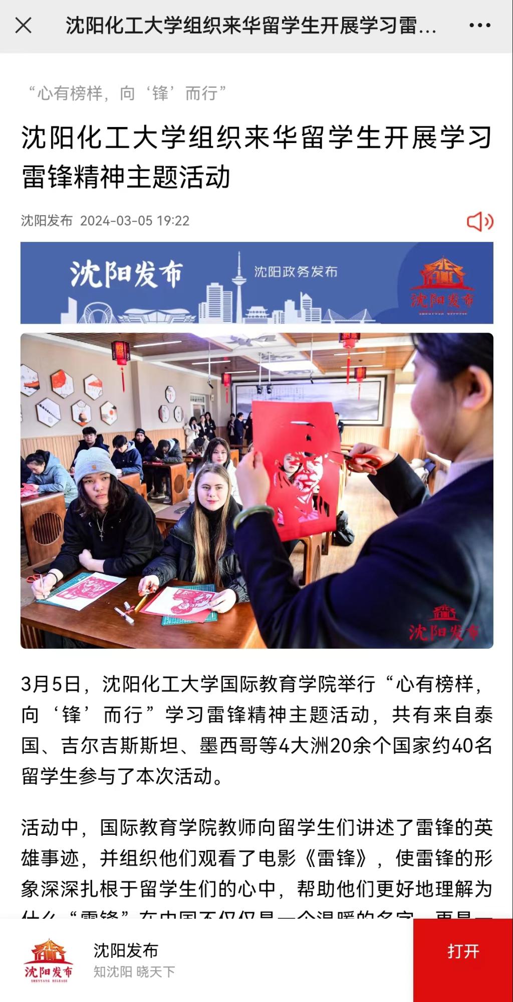 3月5日,在全国第61个学雷锋纪念日到来之际,万象城国际教育学院组织来华留学生开展“心有榜样,向‘锋’而行”学习雷锋精神主题活动,共有来自俄罗斯、也门、泰国、吉尔吉斯斯坦、越南、老挝、蒙古、巴基斯坦、印尼、肯尼亚、坦桑尼亚、乍得、墨西哥等4大洲20余个国家约40名留学生参与其中。本次活动获得了东北新闻网、辽望客户端、沈阳日报、“沈阳发布”客户端、沈阳发布英文公众号、《中国日报》“留学中国”海外社交媒体平台、辽宁国际传播中心海外平台Facebook以及Twitter等多家省市级媒体的报道和转载。