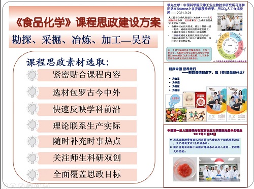 《食品化学》课程团队前期进行了深入细致的课程分析和学情分析,在此基础上通过课程思政-课程内容的“一体化”设计、课程思政的“滴灌式”实施和课程思政多维度考核等方面的探索,建立了指导思想有高度、思政素材有广度、实施方法有温度、实施评价多维度、实施效果有丰度的课程思政实施方案,形成了“课课有思政,例例有侧重”、“由浅入深,由小及大,由点到面”的课程思政教育设计,摸索出课程思政与课程教学内容水乳交融的“滴灌式”的教学方法,使教师“引导有抓手、融入有依据”,在专业课程教学过程中提升学生的家国情怀、专业自豪感和社会责任感。