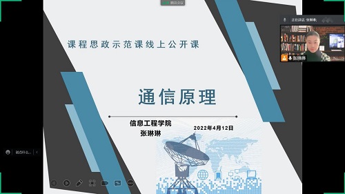 4月12日上午,校级课程思政示范课云端公开课第七讲《通信原理》正式开课。信息工程学院张琳琳老师以“树立科技自信,构建交互式教学课堂”为题分享课程思政改革成果,该门课程是电子信息工程等专业的专业基础课,2020年被评为校级首批“课程思政示范课程”。张琳琳老师曾多次参加校级青年教师讲课大赛、课程思政能力大赛等教学比赛,并取得优异成绩。