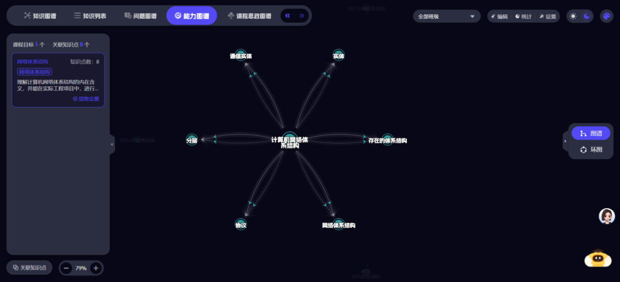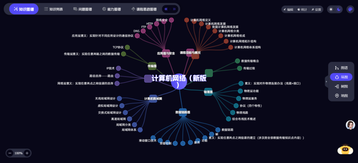 课程团队基于超星泛雅平台,集成DeepSeek-化大小计等大模型能力,打造《计算机网络》智慧课程平台,建立97个知识点、14个知识点资源、1260个教学资源、54个拓展资源,形成知识图谱、能力图谱、课程思政图谱等相关数字资源,为智慧课程建设打下良好的基础。学生可通过自然语言提问,AI助手即时生成可视化解析,学生学习的效率得到大幅度提升。