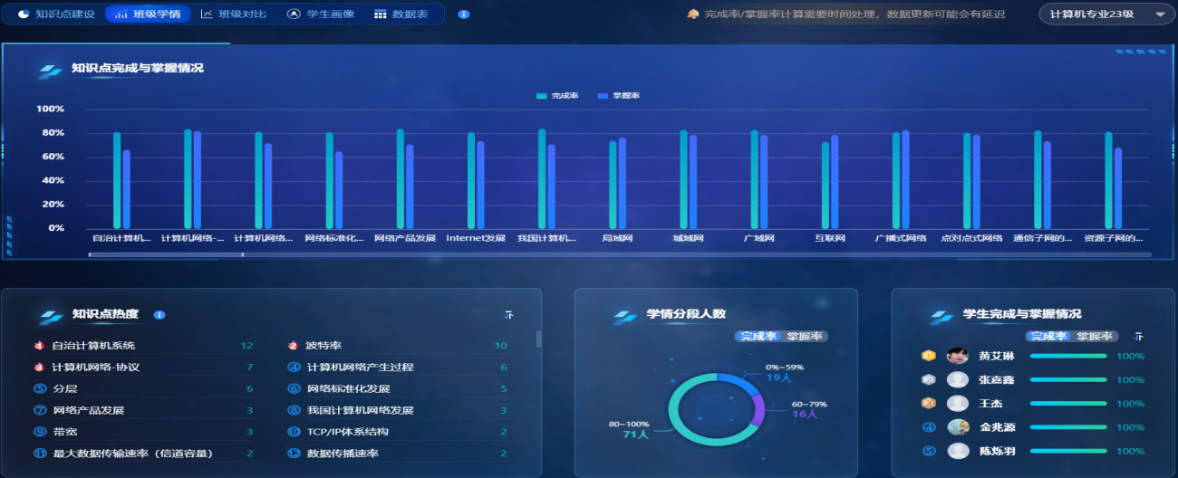 打破“理论抽象难理解、实验操作受局限、学情诊断不精准”的传统困境,计算机科学与技术学院王军教授带领《计算机网络》国家级一流课程团队进行智慧课程建设,构建起“AI 深度赋能-仿真平台支撑-数据精准驱动”的三维智能教学体系。将人工智能技术全面融入教学全过程,推动课程从“知识传授”向“能力培育”的系统性跃迁。