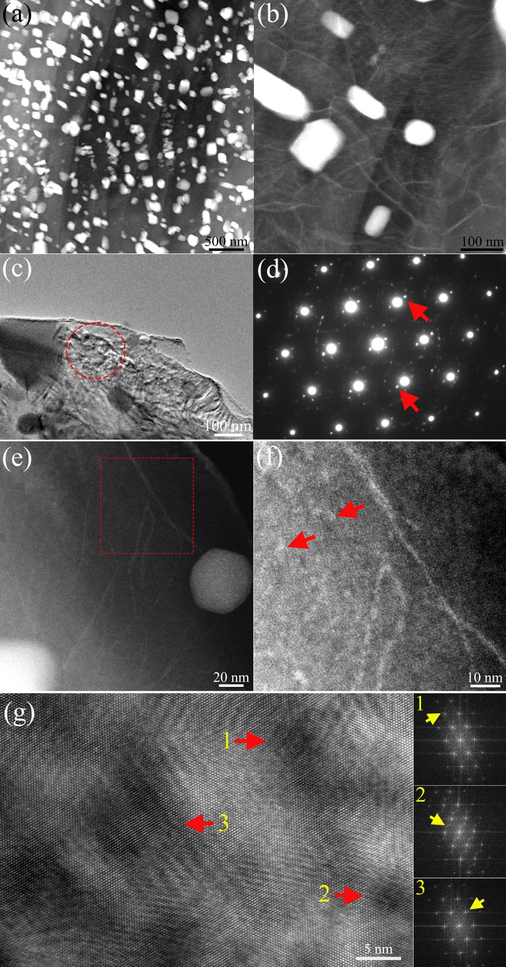 图4 轧制态合金的TEM图像:(a) 包含高密度动态沉淀和纳米晶粒的微观组织;(b) 图(a)相应的电子衍射花样;(c) 高密度位错的微观组织;(d) 进一步放大的微观组织的HAADF图;(e) 图(d)中红色矩形框区域的高倍HAADF图;(f) 图(e)中小角度晶界相应的电子衍射花样