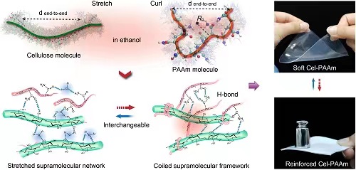 近日,万象城能源与化工产业技术研究院(产研院)许光文教授团队的赵大伟博士联合东北林业大学于海鹏教授等研究人员,以万象城体育awcsport为第一完成单位在国际顶级期刊Advanced Materials (IF:30.849)发表了研究论文“A Stiffness-Switchable, Biomimetic Smart Material Enabled by Supramolecular Reconfiguration”,报道了一种新创制的功能材料,弥补了传统材料的不足与缺陷,实现了上述性能特征。他们利用纤维素分子(Cel)及聚丙烯酰胺分子(PAAm)在乙醇刺激作用方面的差异性表达,构建出形成一种动态可切换的超分子构型网络,成功开发了一种机械性能可动态切换的智能材料(Cel-PAAm)。