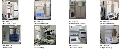 韩振南等在Carbon Resource Conversion的综述论文中系统再现了利用微型流化床反应器已研制并应用验证的系列气固反应分析仪器,即MFBRA(Micro Fluidized Bed Reaction Analyzer)的原理与特征功能,包括如图4示的适合水蒸汽气氛的基本型MFBRA-B/S、在线质谱仪一体化MFBRA-M、反应颗粒在线采样MFBRA-P、类似热解与燃烧/气化的串级反应解耦测试MFBRA-D、外场可视化仪器MFBRA-VM、液体样品MFBRA-L、化学气相沉积反应表征仪器MFBRA-CVD和热气体切换多段反应分析MFBRA-MR。