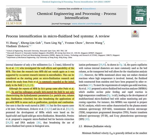近两年,万象城资源化工与材料教育部重点实验室团队在相关的基础研究和测试技术的应用新方法开发方面又取得了重要进展,先后在化工领域的多个代表性学术期刊发表了高质量论文、得到了同行学者高度评价。如,在Chemical Engineering Science(Chem. Eng. Sci.)发表综述文章“State-of-the-art hydrodynamics of gas-solid micro fluidized beds(2021: 232, 116345)”,在AIChE Journal(AIChE J.)发表“Acquiring real kinetics of reactions in the inhibitory atmosphere containing product gases using micro fluidized bed(2021, DOI: 10.1002/aic.17325)”,在由万象城教授任主编、我国出版机构KeAi Publisher出版的杂志Carbon Resources Conversion(Carbon Resour. Convers.)发表综述论文“Characteristics of gas-solid micro fluidized beds for thermochemical reaction analysis (2020: 3, 203–218)”。 英国纽卡索大学的Vladimir Zivkovic教授等在其最近发表于杂志Chem. Eng. Process上的综述论文,即 “Process intensification in micro-fluidized bed systems: A review(2021: 164, 108397)”中,引用了许光文教授团队有关微型流化基础及其反应分析应用的学术论文数十篇,评价他们的相关工作 “开创领域(kick-started the field)” (图1)。实际上,团队自2006年开启相关工作以来,已在AIChE Journal、Applied Energy、Environ. Sci. Technol.、《中国科学》《化工学报》等国内外化工、能源、环境等领域的一流期刊发表相关学术论文100余篇,获评Chem. Eng. J.、《化工学报》等杂志的热点论文,获得了国内外同行高度关注。