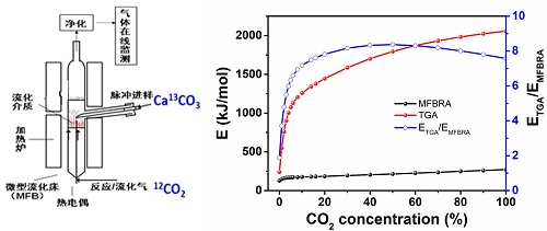 以CO2气氛中发生的碳酸钙分解反应为例,刘雪景等发表在AIChE Journal的研究揭示了热重分析仪(TGA)难以正确获得“气体产物抑制性气氛中的气固反应”动力学参数的事实,创立了“碳同位素标记微型流化床反应测试方法”,获得了反映真实特性的CO2气氛中碳酸钙分解反应的动力学参数。如图3示,100% CO2气氛中通过TGA和微型流化床测试法获得的CaCO3分解反应活化能分别为2047和272 kJ/mol,表明TGA测试的数据明显不合理。
