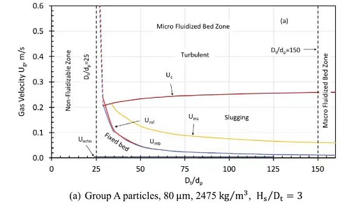 图2 气固微型流化床流型转变相图(Chem. Eng. Sci., 2021: 232, 116345)