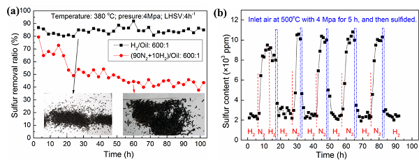 图3左表明,催化剂在反应100小时后仍然保持了较高的脱硫活性,但使用含CO2的混合氢致使重馏分(350 oC- FBP)更易裂解在催化剂表面大量积碳,导致催化剂快速失活。为验证图1所示双反应器工艺,使用氮气替代H2使催化剂快速失活,进而在空气氛围中原位焙烧催化剂,再使其硫化后用于页岩油的加氢提质,以评价催化剂的重复使用寿命。图3右表明:经过5次循环,催化剂仍然保持了良好的脱硫活性,从而证明图1所示反应再生切换工艺的可行性。