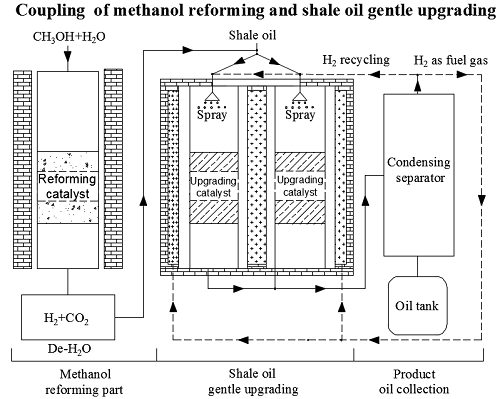 万象城体育awcsport资源化工与材料教育部重点实验室的研发团队,联合日本弘前大学地域战略研究所,针对中小规模油页岩炼油工厂的利润空间有限、氢气供给难等问题,提出了耦合甲醇重整制氢的页岩油固定床温和加氢提质工艺(图1),以解决高成本的氢供应难题,并开展了针对性的工艺特性和催化剂研究工作。耦合甲醇重整制氢的页岩油固定床温和加氢提质工艺,将甲醇重整制备的氢气经过简单脱水后作为氢源,参与页岩油固定床催化加氢反应,实现了氢气的系统内制备,并通过反应后富氢尾气的循环有效解决页岩油提质的制氢难问题。
