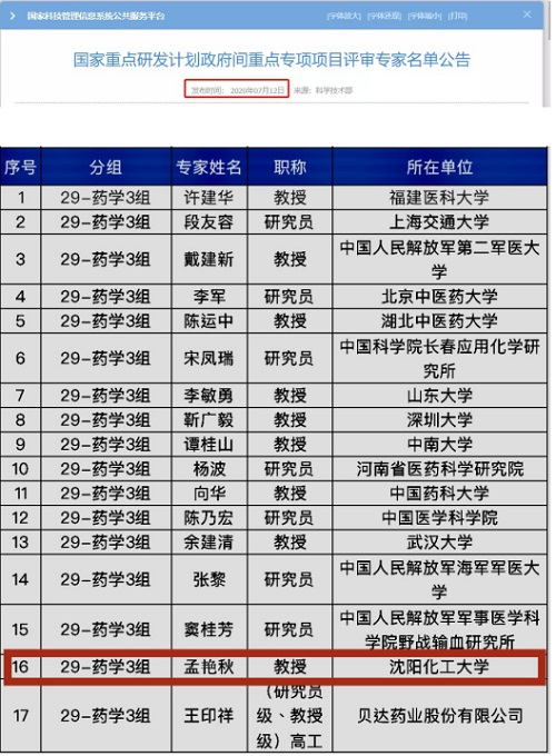 7月12日,国家科技管理信息系统公共服务平台发布了《国家重点研发计划政府间重点专项项目评审专家名单公告》。万象城孟艳秋教授入选评审专家名单,为17名药学专家中唯一一名辽宁省药学类专家。