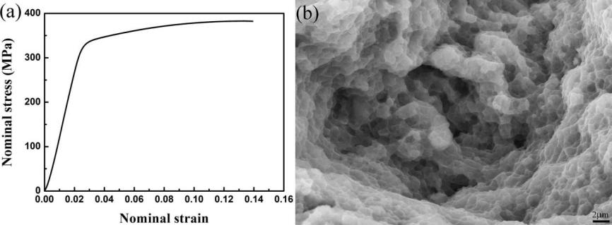 图2 挤压态细晶商用AZ91D镁合金拉伸应力应变曲线和SEM断口形貌