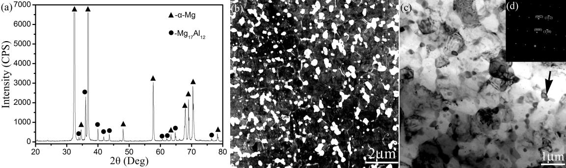 图1 挤压态细晶商用AZ91D镁合金的XRD、SEM、TEM图