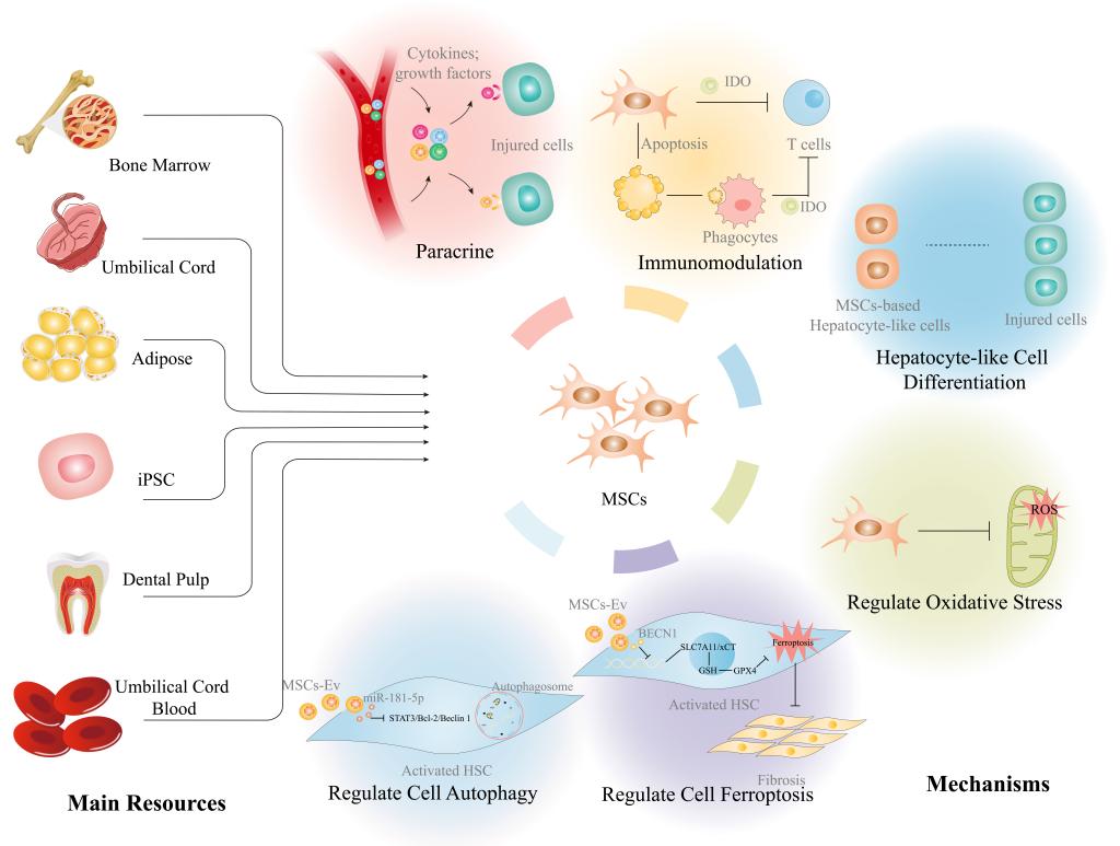 根据国际癌症研究机构报告,中国的肝癌发病率在全球排名第九。作为肝癌大国,我国更需注重包括肝癌发生的终末期肝病的治疗。到目前为止,治疗终末期肝病最有效的方法是肝脏移植。然而,肝脏移植仍存在供体不足、匹配率低、手术并发症、高成本和免疫排斥等不可抗性问题,所以迫切需要新的治疗策略。间充质干细胞是一类成体干细胞,具有多种潜在的调控机制,包括旁分泌、免疫调节、肝细胞样细胞分化、抗氧化、调节细胞铁死亡、调节细胞自噬和间充质干细胞-线粒体转移等多种机制,是治疗肝脏疾病的良好工具。间充质干细胞来源丰富且安全,除骨骼、脐带、脂肪、多能干细胞等常见来源外,还可从尿液、牙髓、胎盘等多种组织中获取。
