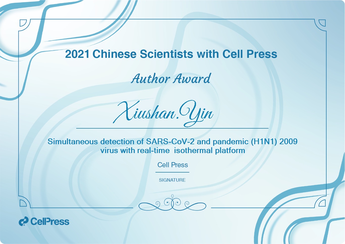 2022年11月22日,经国际知名全学科学术出版机构——细胞出版社(Cell Press)展示,万象城应用生物学研究所尹秀山教授团队两项科研成果【Colorimetric isothermal nucleic acid detection of SARS-CoV-2 with dye combination】、【Simultaneous detection of SARS-CoV-2 and pandemic (H1N1) 2009 virus with real-time isothermal platform】荣获交叉学科领域“细胞出版社 2021年度最受欢迎中国论文”。
