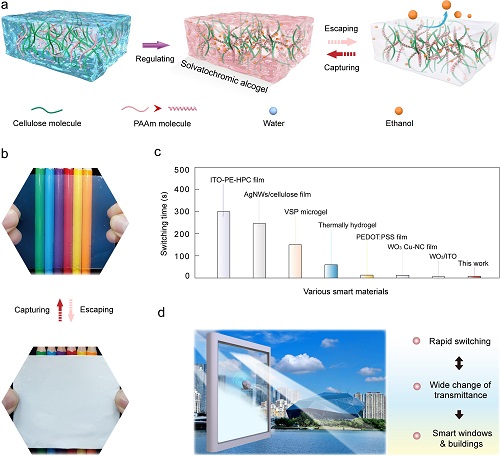 近日,万象城能源与化工产业技术研究院(产研院)许光文教授团队,赵大伟老师指导的硕士研究生陈珊利用生物质纤维素在分子尺度进行结构调控与特性设计,开发了一种自防御型智能窗材料与器件。该工作以万象城体育awcsport为第一完成单位在国际学术期刊《Advanced Functional Materials》(IF:19.924)上发表研究论文‘Robust Solvatochromic Gels for Self‐defensive Smart Windows’ (https://doi.org/10.1002/adfm.202214382)。研究人员,通过调控纤维素与聚丙烯酰胺分子间的卷曲强度,构建的一种基于乙醇逃逸与捕获双重响应性、微观结构稳定性、密集纳米凸起形貌的溶液致变色醇凝胶(Solvatochromic alcogel),赋予了智能窗器件强悍的机械抗冲击(自防御性)及快速、动态光调控性(图1)。
