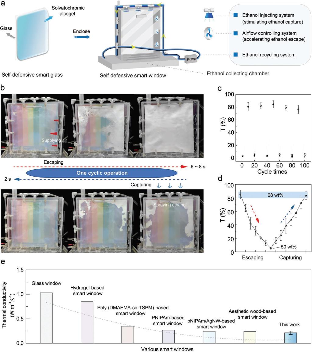 基于溶液致变色醇凝胶出色的光调控性能与强悍的机械力学特性,研究者设计了一种仅溶剂刺激的自防御型智能窗器件,其可达到的循环调控光响应行为超过100次(图3),且可根据个人喜好实时调控智能窗的光透过率。相比于已报道的智能窗器件,该自防御型智能窗展现出较低的导热系数0.214 W m−1 K−1,及强悍的抗外力破损行为,在建筑节能、自我防御及固碳循环等领域展现出巨大的潜力应用。