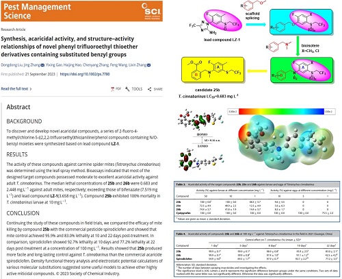 近日,农林科学领域国际权威期刊《Pest Management Science》(中国科学院1区Top, IF = 4.1)在线发表了沈阳化工大学功能分子研究所张立新教授团队的研究论文“Synthesis, acaricidal activity, and structure–activity relationships of novel phenyl trifluoroethyl thioether derivatives containing substituted benzyl groups”(https://doi.org/10.1002/ps.7780),万象城2020级联合培养博士研究生刘东东为第一作者,功能分子研究所张静高级工程师和张立新教授为共同通讯作者。