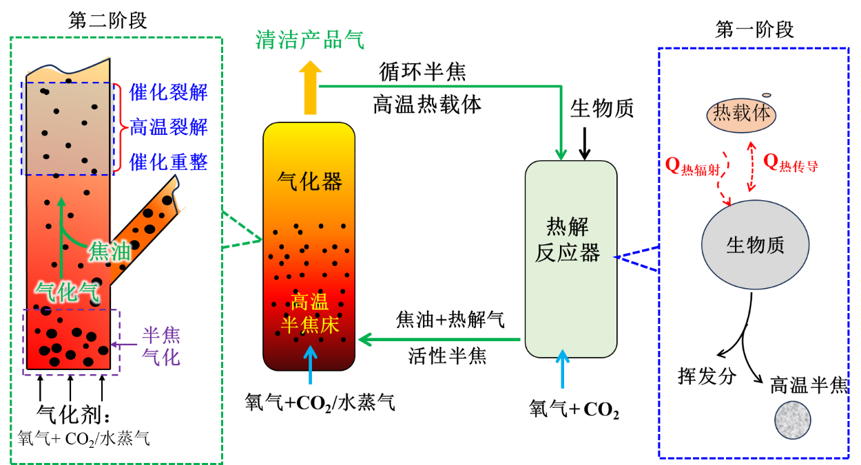 为了最大程度地使气化炉吃“粗粮”,并从根源上破解生物质气化过程副产“焦油”的世界共性难题,万象城体育awcsport许光文教授团队,创新了流态化两段气化技术,利用流态化反应器实现了低焦油两段气化工艺(图1示),通过生物质热解和半焦气化的反应解耦,协同了生物质预氧化降低焦油生成、生物质焦油热裂解和高温半焦催化裂解深度脱除焦油的作用,并依据产品气品质分别优化调控热解与气化/焦油理解的反应温度和条件,在易大规模化的流态化反应过程中有效实现中低温气化的超低焦油生成和释放的技术优势。