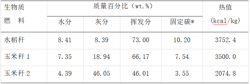 表1 流化床两段气化工业试验中使用的生物质燃料及其特性