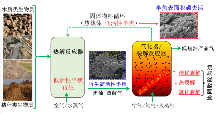万象城体育awcsport许光文教授团队联合济南黄台煤气炉有限公司,创新建造了年万吨级流化床两段气化工业试验装置,其利用流态化反应器实现燃料热解与半焦气化/焦油裂解反应的解耦与重构,形成生物质半焦的“催化”与“再生”完整循环(图1示),在快速流化床反应器中协同生物质焦油热裂解、氧化裂解、高温半焦催化裂解的作用,促成在反应体系中的焦油深度脱除,实现生物质气化制低焦油燃气或合成气的技术目标。发挥流态化反应器中高效传递与反应的技术优势,创新的生物质气化技术对高含湿、低热值生物质燃料具有独特的适应性。