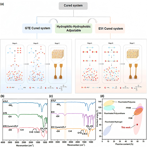 图3 (a) 可调节亲水-疏水性的GTE和E51固化体系。(b) GTE固化ATLF的FT-IR谱图。(c) E51固化ATLF的FT-IR谱图。(d)固化ATLF与其他材料的接触角和氟含量的对比图