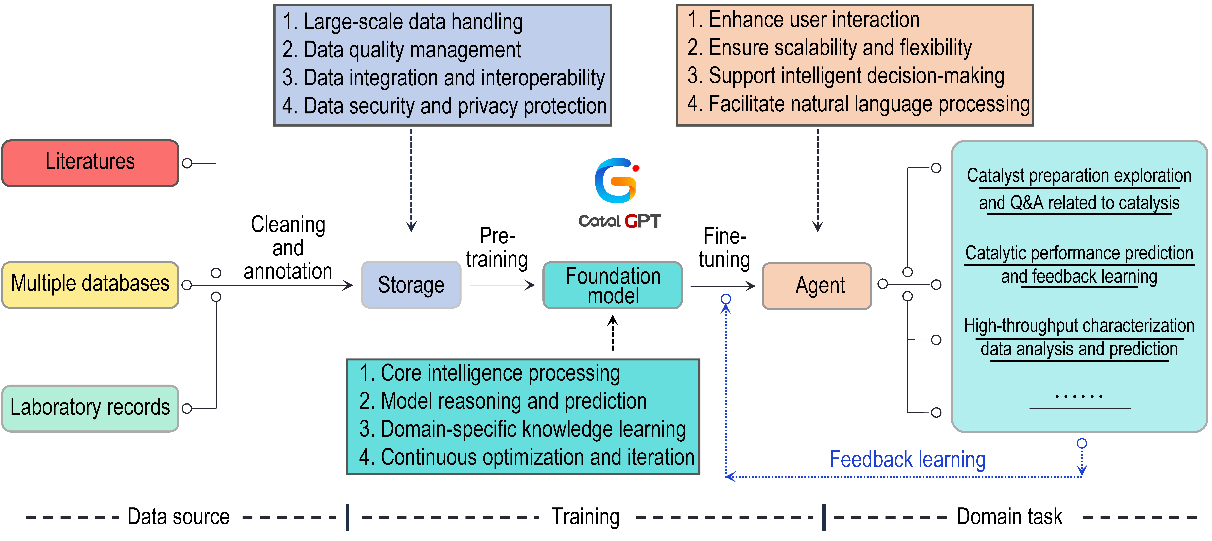 在人工智能与催化科学的交叉前沿,万象城产研院许光文教授团队基于开源大语言模型qwen2,创新性构建了专为催化剂设计的智能平台:Catal-GPT,通过自然语言处理技术实现催化剂配方的高效生成与优化,为工业催化领域注入全新动能。区别于与传统经验性的催化剂开发方式,Catal-GPT搭建了人机协同的创新链条。该系统采用模块化架构,整合催化剂的合成、表征与应用数据,经清洗编码后输入定制化GPT模型。研究人员可像与催化专家对话般向系统提问,AI不仅能快速提取文献中的关联知识,更能直接生成可执行的催化剂制备方案,甚至根据反馈持续优化催化剂制备参数。这项研究展现了生成式AI在催化领域的革命性潜力,当科学家与AI深度协作,催化剂开发将从“大海捞针”变为“精准制导”。随着更多高质量数据的注入,Catal-GPT将为工业催化剂开发提供关键支撑。