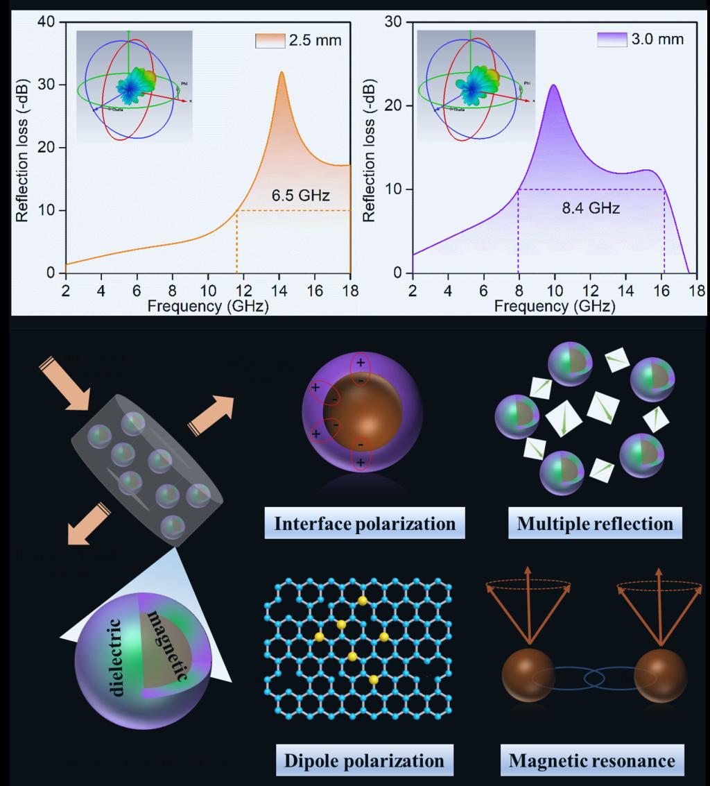 在上述研究基础上,研究者进一步通过精确调控材料结构构建了具有内部可控空腔和壳层可调特性的空心核壳Fe3O4@MoS2微球。系统研究表明,空心Fe3O4微球因其独特的结构特征表现出显著的铁磁共振效应,在C-X波段展现出优异的电磁波吸收性能。通过精细的结构调控,所设计的空心核壳Fe3O4@MoS2微球不仅实现了在薄匹配厚度下的强吸收特性,同时具备宽频吸收优势。深入机理分析揭示,该材料体系通过Fe3O4核与MoS2壳层的协同作用,产生了显著的界面极化、缺陷/偶极子极化以及多重散射效应,从而实现了良好的阻抗匹配和卓越的电磁波衰减性能。特别值得指出的是,Fe3O4@MoS2-2样品在2.66 mm匹配厚度下获得-69.01 dB的最小反射损耗,当厚度为3.0 mm时,其有效吸收带宽可达8.40 GHz。本研究系统阐明了核壳结构与电磁波吸收性能的构效关系,为通过结构优化设计高性能吸波材料提供了重要的理论指导和实验依据。