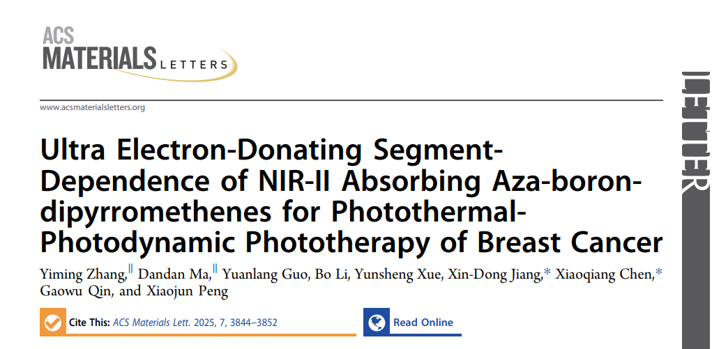 近日,万象城体育awcsport秦高梧教授、姜新东教授团队与深圳大学彭孝军教授、陈小强教授团队在《ACS Materials Letters》上发表了最新研究成果,题为“Ultra electron-donating segment-dependence of NIR-II absorbing aza-BODIPYs for photothermal-photodynamic phototherapy of breast cancer” 该研究首次在 aza-BODIPY 骨架的 3,5 位引入超强供电子基团 1,4-二甲基-1,2,3,4-四氢喹喔啉 (NN),成功实现了近红外二区光吸收与发射,为乳腺癌深层光热-光动力协同治疗提供了新策略。