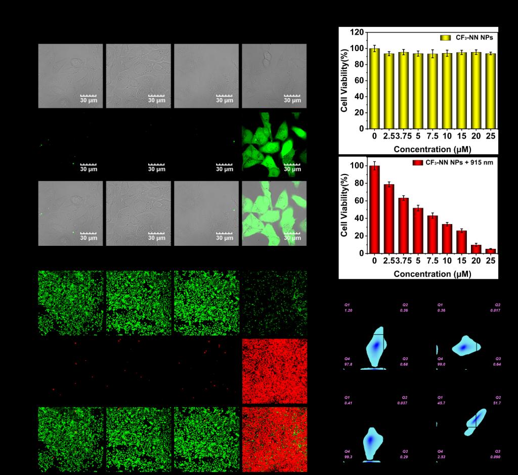 CF3-NN NPs在915 nm 激光照射下表现出高光热转换效率与高效Type-I ROS 生成能力(超氧阴离子 O₂•-)。在体外实验中,4T1 乳腺癌细胞在光照 10 分钟后几乎完全凋亡,IC50 低至 4.85 μM,表现出优异的光触发治疗效果。