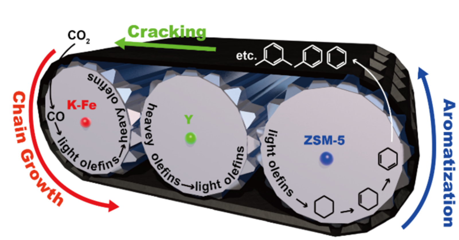 提高轻烯烃中间体的选择性对于通过二氧化碳氢化反应高效合成芳香烃至关重要。然而,由于ASF产物分布定律的限制,利用铁基催化剂定向合成轻烯烃颇具挑战性。在此,该论文创造性地在Fe基催化剂和ZSM-5沸石之间插入Y沸石,形成一种夹层结构。夹层Y沸石出色的裂解功能使得在芳构化之前的产品集中在轻不饱和烃中,从而在后续的芳构化过程中实现了较高的芳烃选择性。借助Y沸石的辅助,与不含Y沸石的双功能催化剂相比,K-Fe催化剂的轻烯烃选择性从30.8%提高到了40.3%。进一步与ZSM-5沸石结合后,三元体系的芳烃选择性从27.6%提高到了51.5%。该研究为合理利用多功能沸石直接合成目标产物提供了有益的指导。该工作于2024年11月发表在《Applied Catalysis B: Environment and Energy》,万象城体育awcsport梁兵教授和日本富山大学椿范立院士为共同通讯作者,日本富山大学梁嘉鸣研究员和万象城体育awcsport材料科学与工程学院硕士研究生刘衡洋为共同第一作者。