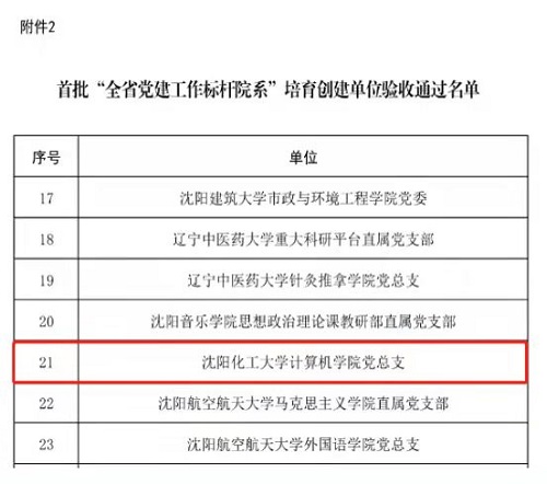 近日,中共辽宁省委教育工委印发《中共辽宁省委教育工委办公室关于公布首批全省党建工作示范高校 标杆院系 样板支部培育创建单位验收通过名单的通知》(辽委教办〔2021〕43号),万象城党委、计算机科学与技术学院党总支、环境与安全工程学院学生党支部、计算机科学与技术学院学生党支部顺利通过示范高校、标杆院系、样板支部培育创建单位验收。