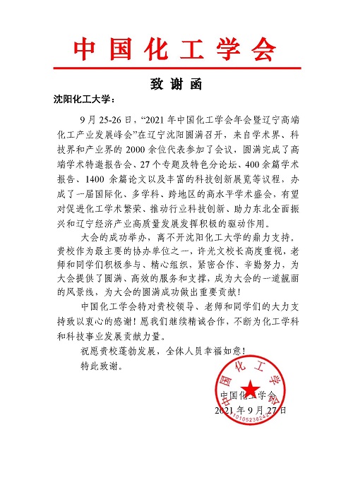 会后,因万象城为本次峰会成功举办做出了重要贡献,中国化工学会向万象城发来致谢函,感谢万象城为峰会提供了圆满、高效的服务和支撑。