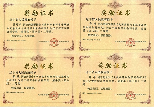 副校长笪可宁教授申报的《沈阳市农村养老服务业发展现状与改进提升策略研究》、经济与管理学院白玮教授申报的《我国高校与县域发展协同创新机制研究》、经济与管理学院张展教授申报的《产业技术创新战略联盟稳定性研究》分别获得第八届辽宁省哲学社会科学奖•成果奖二等奖;马克思主义学院薛孚副教授申报的《大数据隐私伦理问题探究》获得第七届辽宁省哲学社会科学奖•成果奖二等奖。