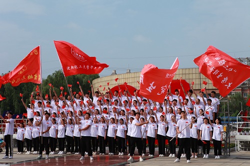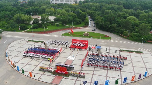 升旗仪式尾声,全场齐声高唱《没有共产党就没有新中国》,歌声嘹亮,久久回荡,传递出化大师生红心永向党,奋进新时代的豪情壮志。