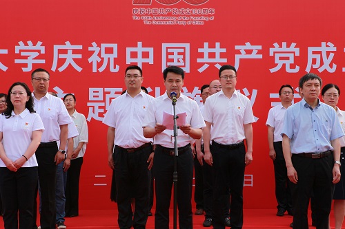 党委书记王强以《回望百年奋斗路 开启化大新征程》为题作了讲话。他表示,要准确把握党历史发展的主流本质,从党的不懈奋斗中追寻革命足迹,继续将党的教育事业进行到底;从党的不怕牺牲中弘扬革命传统,赓续共产党人的精神血脉;从党的理论探索中感悟思想伟力,坚持用党的创新理论指导实践;从党的为民造福中厚植人民情怀,始终把人民利益放在最高位置;从党的自身建设中汲取精神智慧,以高质量党建引领、推进和保证学校高质量发展。