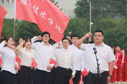 党委委员、党委宣传部部长肖于波带领百名新生党员代表宣誓;在场的老党员重温入党誓词。昂扬高亢的宣誓声展现出化大人永远跟党走的信心和决心。