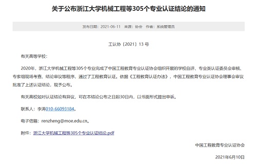 6月11日,中国工程教育专业认证协会正式发布了《关于公布浙江大学机械工程等305个专业认证结论的通知》(