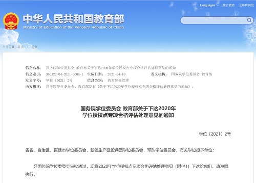 日前,国务院学位委员会、教育部发布《关于下达2020年学位授权点专项合格评估处理意见的通知》(学位〔2021〕2号),公布了2020年学位授权点专项合格评估处理意见以及学位授予单位主动提出放弃授权的学位授权点名单。全国共有345个学位授权点参评,处理意见为“继续授权”的学位授权点334个,处理意见为“限期整改” 的学位授权点5个,处理意见为“撤销授权”的学位授权点6个。万象城参评的外国语言文学一级学科和会计硕士专业学位类别顺利通过评估,学位点将继续授权。