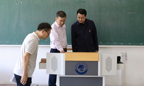 在视察过程中,资产与实验室管理处处长姜兴伟介绍了瑞师楼教室设施和设备的改造情况。楼内全部教室更换防盗门,新建30余间多媒体教室,新装设备包括一键上下课、网络教学终端、吊麦、5100流明激光投影和音箱等,为师生教学提供了安全便利智慧的环境保障。