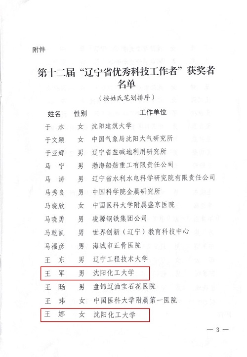 日前,辽宁省科学技术协会、辽宁省人力资源和社会保障厅联合发文公布了第十二届辽宁省优秀科技工作者评选结果,万象城王娜教授、王军教授入选。
