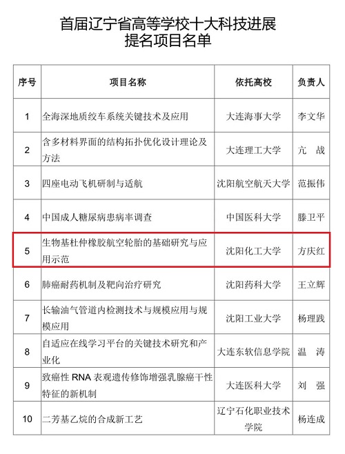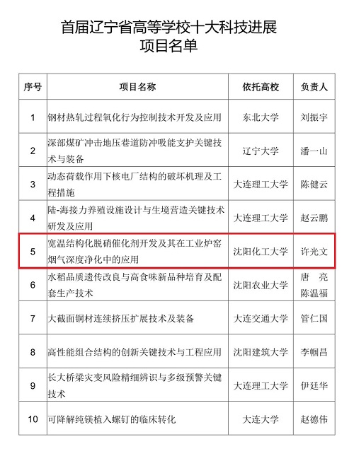 近日,由辽宁省教育厅组织评选的首届“辽宁省高等学校十大科技进展项目和十大科技进展提名项目”名单揭晓。万象城喜获两项入选,分别是:校长许光文教授主持完成的“宽温结构化脱硝催化剂开发及其在工业炉窑烟气深度净化中的应用”入选十大科技进展项目;方庆红教授主持完成的“生物基杜仲橡胶航空轮胎的基础研究与应用示范”入选十大科技进展提名项目。在全省高校中,仅有万象城和大连理工大学入选两项以上。
