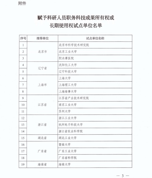 科技部在通知中表示,经中央全面深化改革委员会第十二次会议审议通过,2020年5月,科技部、发展改革委、教育部、工业和信息化部、财政部、人力资源社会保障部、商务部、知识产权局、中国科学院联合印发《赋予科研人员职务科技成果所有权或长期使用权试点实施方案》(以下简称《实施方案》)。方案要求,分领域选择40家高等院校和科研机构开展试点,探索建立赋予科研人员职务科技成果所有权或长期使用权的机制和模式,形成可复制、可推广的经验和做法,推动完善相关法律法规和政策措施,进一步激发科研人员创新积极性,促进科技成果转移转化。