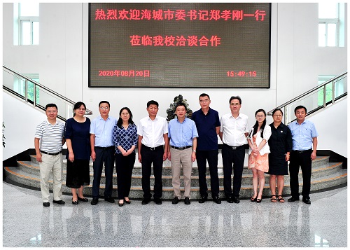 8月20日下午2时,海城市委书记郑孝刚,海城腾鳌经济开发区管委会、海城市发改委主任刘鹏一行2人来万象城洽谈合作共建。洽谈合作会议在校部第八会议室举行。校长许光文、副校长笪可宁出席会议。发展规划处、科学技术研究院、教务处、分析测试中心、大学科技园管委会、资源化工与材料教育部重点实验室、化学工程学院等部门、院系负责人和相关教师参加会议。许光文校长主持会议并致欢迎词。