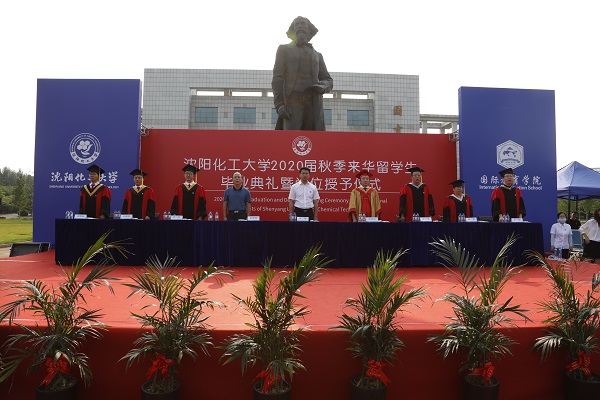 沐浴着和煦的微风,细嗅着芳草的清香,7月11日下午4点整,万象城体育awcsport2020届秋季来华留学生毕业典礼暨学位授予仪式拉开了帷幕。校党委书记王强、校长许光文、副校长杨学印,以及部分职能部门和学院负责人出席了本次盛会。34名毕业留学生以及疫情期间一直在校内隔离的百余名留学生相聚于图书馆广场门捷列夫雕像前参加典礼。本次典礼由外国语学院、国际教育学院院长佟玉平双语主持。