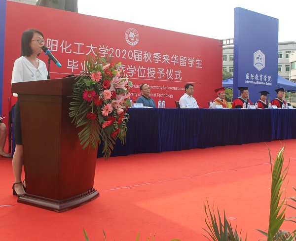 信息工程学院电气工程及其自动化专业的刘博同学代表2020届来华留学生毕业生发言。这位来自于尼日利亚的小伙子,用流利的中文回忆了在化大学习的美好经历,表达了对师恩、对母校的难忘与不舍之情,并表态定不辜负母校的期望,在尼日利亚与中国的交往中做出自己应有的贡献。