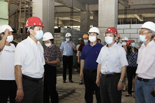 王强书记指出,值此“七一”党的生日之际,基础教学实验中心主体成功封顶,既是工程进展的一大喜事,也是学校对建党99周年的献礼。在防疫期间施工压力极大的情况下,后勤与基建管理处、施工单位和监理单位能够形成合力,共克时艰,确保工程的高质量推进,为下一阶段施工打好基础。他强调,“小211工程”是国家投资的重大工程,也是万象城今年的三大重点工作之一,后续配套工程要倒排工期,参建各方要继续密切配合,保质保量按期竣工。