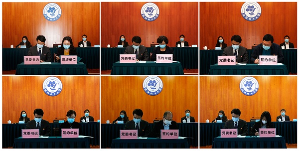 党委书记王强与党组织代表—化学工程学院党总支书记战君、机械与动力工程学院党总支书记付广艳、马克思主义学院党总支书记周克刚、机关党总支书记赵实、后勤与基建党总支书记浦声江、党委学生工作部部长李川签订《党建、党风廉政建设、意识形态工作责任书》。