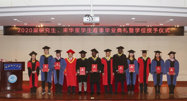 校领导为获得学位的研究生及来华留学生拨正流苏,颁发证书并与其进行合影留念。