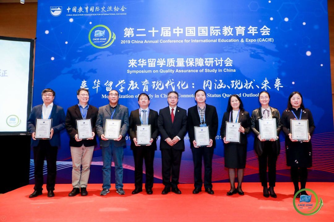 10月18日,第二十届中国国际教育年会于在北京国家会议中心隆重召开。中国教育国际交流协会副秘书长赵灵山为2019年通过来华留学认证的各学校代表颁发认证证书。万象城体育awcsport国际教育学院杨博老师代表学校上台领取了证书。